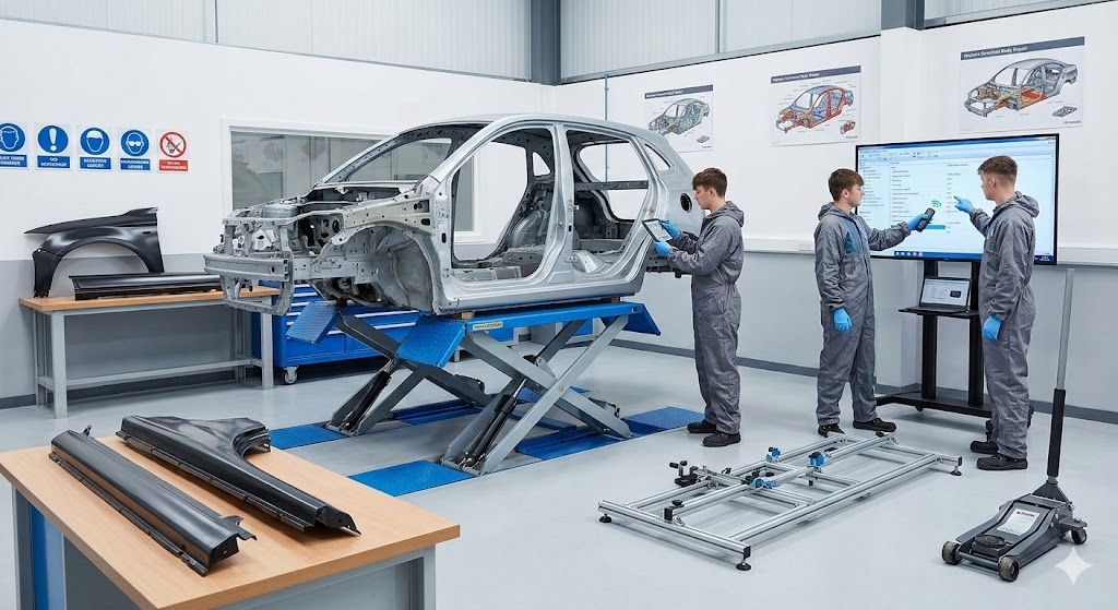 Учебно-производственный комплекс «Инновационные технологии кузовного ремонта» — это современная образовательная площадка, полностью имитирующая рабочий процесс высокотехнологичного кузовного цеха. Мастерская спроектирована для практической подготовки специалистов полного цикла: от оценки повреждений и арматурных работ до сложного восстановления геометрии, сварки металлов и ремонта пластиковых элементов.