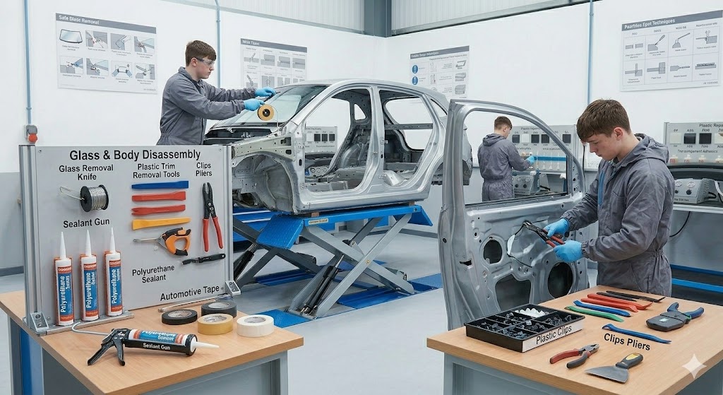- Арматурно-стекольный пост: Предназначен для обучения безопасной разборке салона, снятию клипс, фиксаторов и молдингов. Включает специализированные наборы для срезки автомобильных стекол и работы с полиуретановыми герметиками (пневмопистолеты).